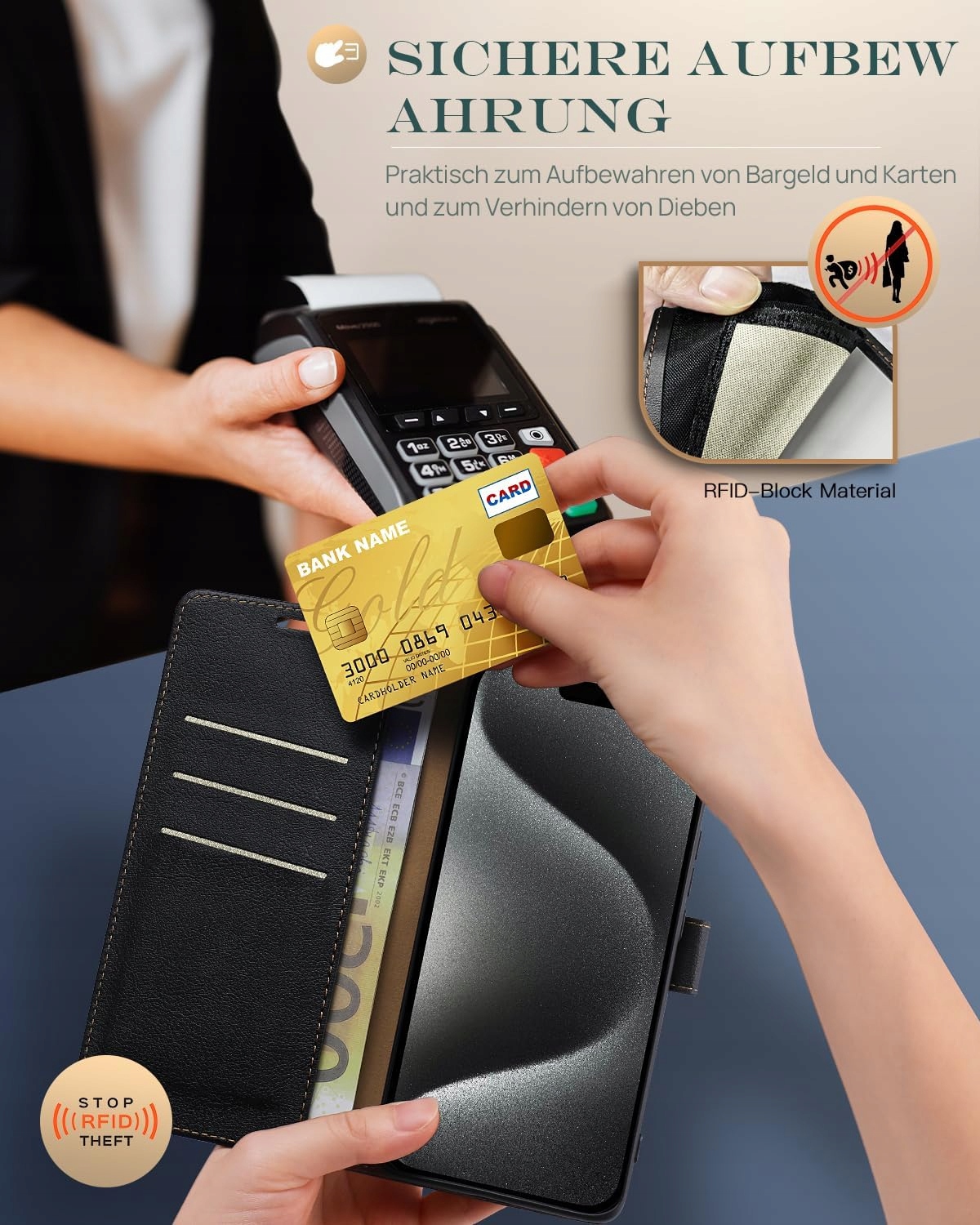 ⭐ Etui z portfelem na iPhone 15 Pro Max posiada dwie przegródki na karty kredytowe, dowód osobisty, wizytówki i kieszeń na gotówkę, kasnbon i rachunki, aby bezpiecznie przechowywać pieniądze i karty, które normalnie trzymasz w portfelu.