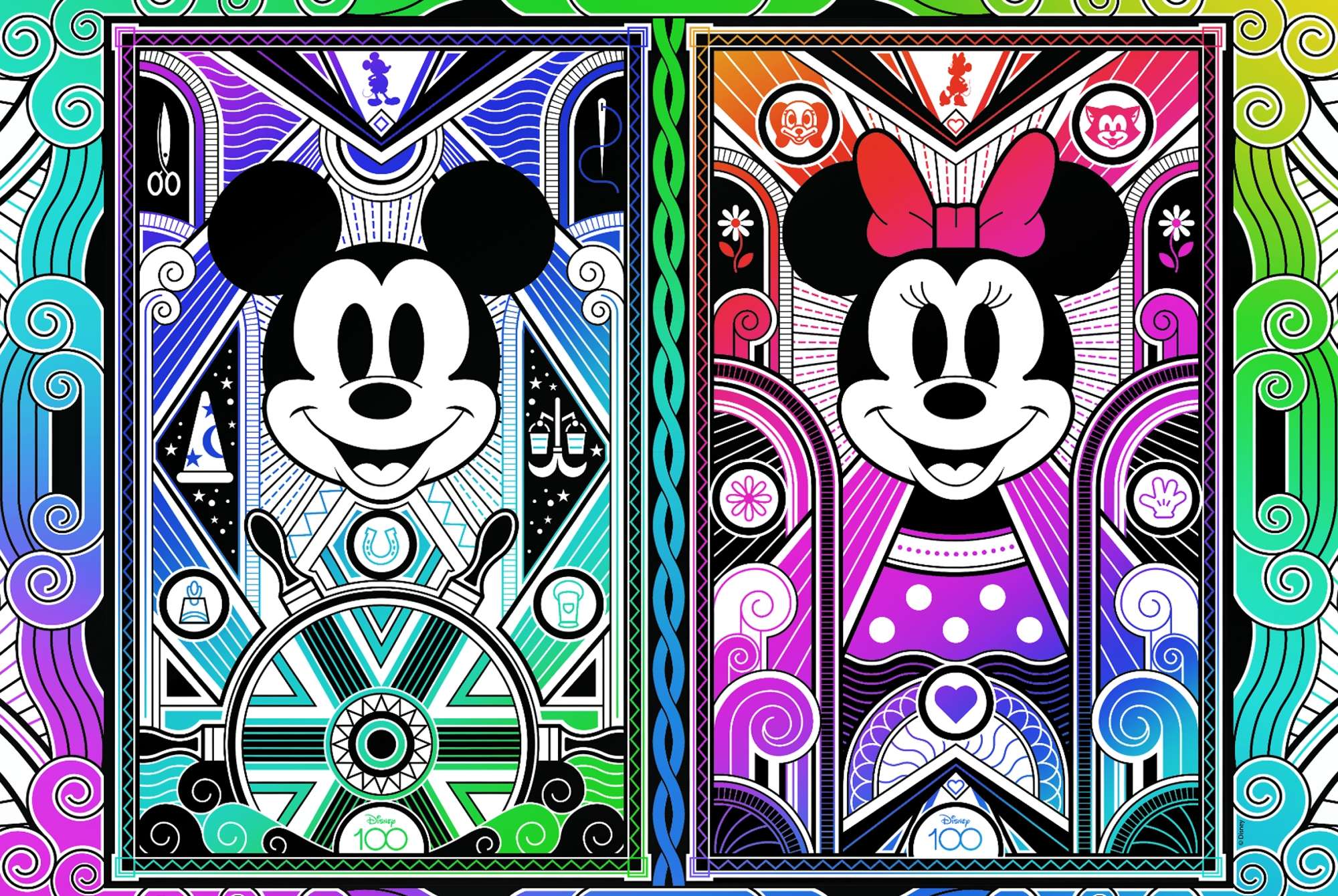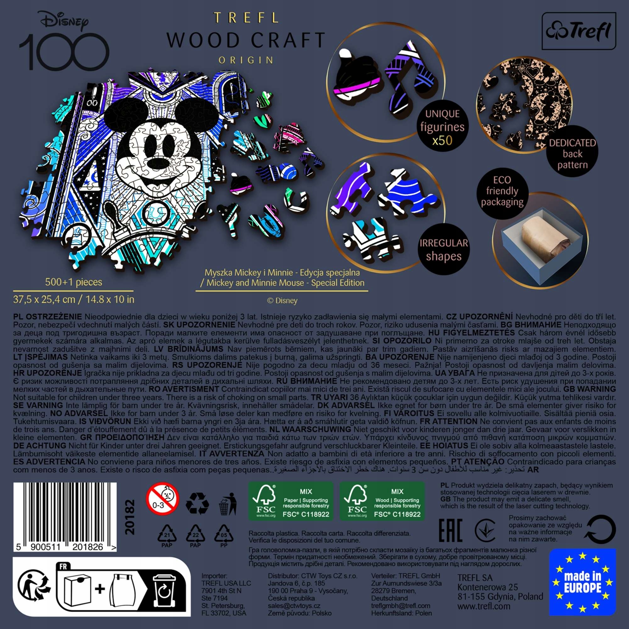 Zestaw składa się z 500+1 puzzli wykonanych z drewna wysokiej jakości i pozwala na ułożenie niezwykle barwnego obrazka o wymiarach 37,5 x 25,4 cm przedstawiający Myszkę Minnie i Myszkę Mickey.
